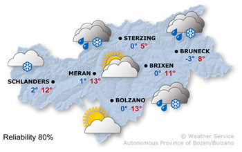 Clouds will prevail over the main Alpine ridge, with intermittent sunshine in the south at first. In the afternoon, rain or snow will begin to fall in the north of South Tyrol, with the snow line rising to 1200-1400 m. The precipitation may also spread further south. The highest temperatures will range between 5° and 13°.