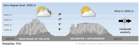 Across South Tyrol’s mountains, a generally fair mix of sunshine and cloud will set in. Sunshine will prevail in the southern ranges and across the Dolomites, while conditions will be generally cloudier along the main Alpine ridge.