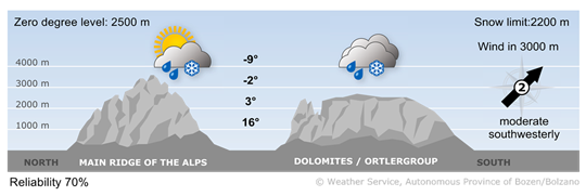 It will be rainy in the morning. In the afternoon, the rain will ease off in the northern parts of the region and the clouds will break up. In the south, the weather will remain unsettled for longer. Temperatures will rise to 16° in the Wipptal valley and up to 19° in the lowlands.