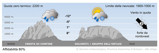 Le precipitazioni sono in esaurimento ed il Föhn da nord ridurrà l'umidità dell'aria. In Val Venosta e nelle zone più a sud saranno possibili delle schiarite. Nel tardo pomeriggio ed in serata da nord arriveranno ancora dei rovesci. Contemporaneamente il limite delle nevicate scenderà verso i 1000 m. Venti forti da nord. Temperature massime tra 9° a Brunico e 13° a Bolzano e Merano.