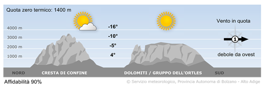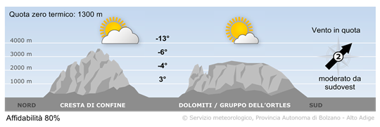 Tempo molto soleggiato con buona visibilità su tutti i gruppi montuosi. Qualche nube sarà presente solo sulla cresta di confine.
