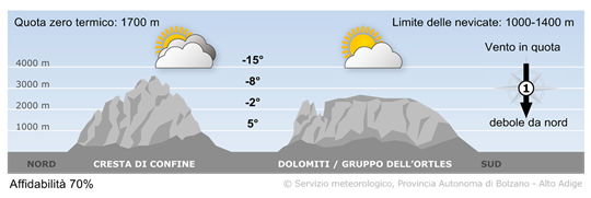 Al primo mattino saranno ancora possibili deboli nevicate. Di seguito il tempo tenderà a migliorare con tratti soleggiati. Annuvolamenti più intensi insisteranno sulla cresta di confine.