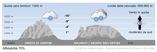 Inizialmente il cielo sarà variabilmente nuvoloso. Nel corso del pomeriggio la nuvolosità tenderà ad aumentare e nella notte successiva saranno possibili deboli nevicate soprattutto tra la Bassa Atesina e la Val Sarentino. Temperature massime tra 0° e 5°.