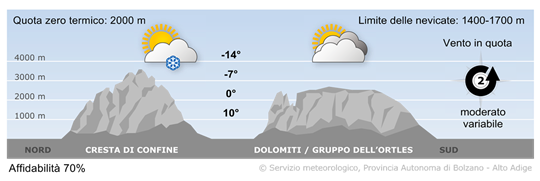 Nel pomeriggio il cielo sarà variabilmente nuvoloso con tratti soleggiati più lunghi a ovest e annuvolamenti più consistenti sulle Dolomiti. In Alta Pusteria soffierà vento da est. Temperature massime tra 10° e 17°.
